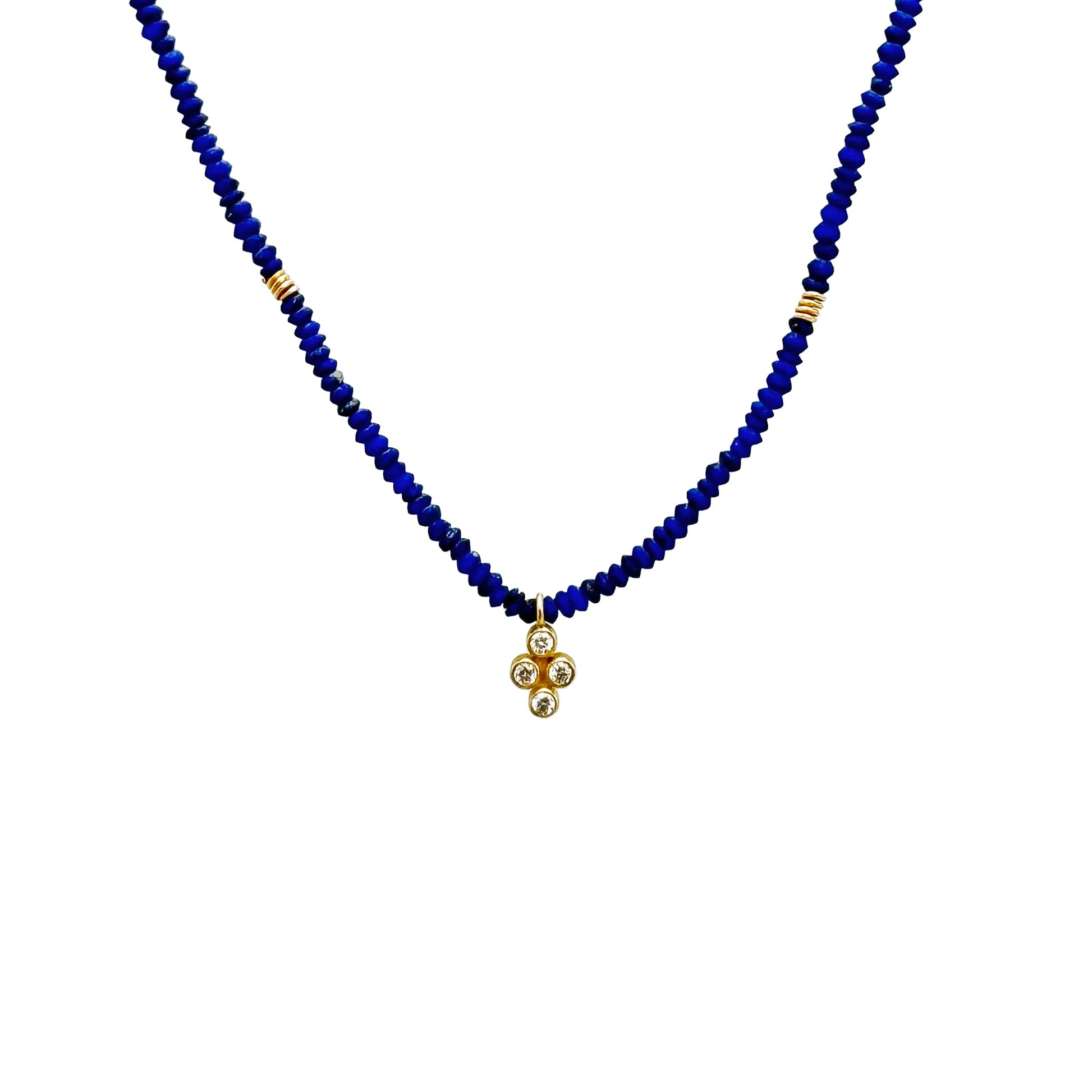 This exquisite necklace features a delicate 18kt gold clover charm adorned with four diamonds, nestled among rich blue lapis lazuli beads. For centuries, lapis has been revered for its symbolism of wisdom and connection to the past, while the clover whispers promises of good fortune. Delicate hand-coiled 18kt gold spacers represent the cyclical nature of time, weaving past, present, and future into a harmonious whole. A profound exploration of symbolism, this necklace is beautifully crafted for everyday wear, blending elegance with timeless meaning.